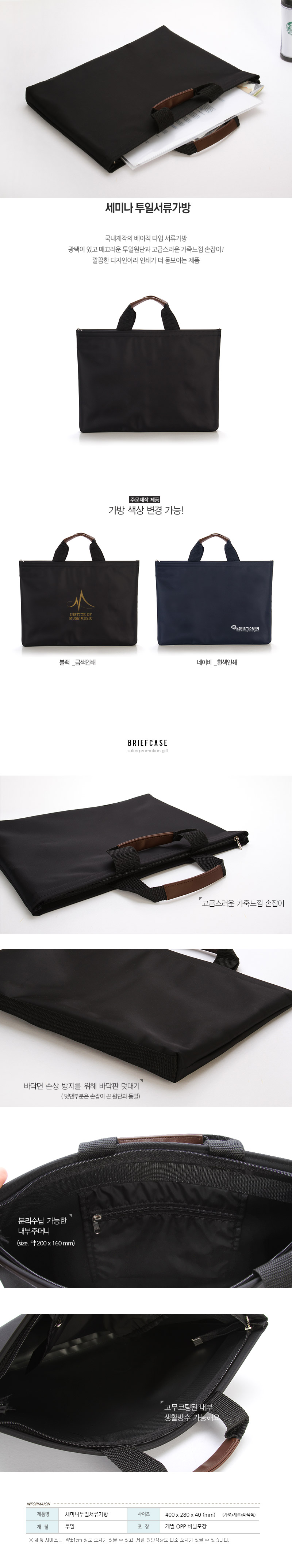 •400×280×40mm •검정, 곤색 / 별색 문의 •입구 지퍼, 안쪽 지퍼주머니 있음 •1색 100개 이상 ※ 사이즈는 ±2cm정도 오차가 있을 수 있습니다