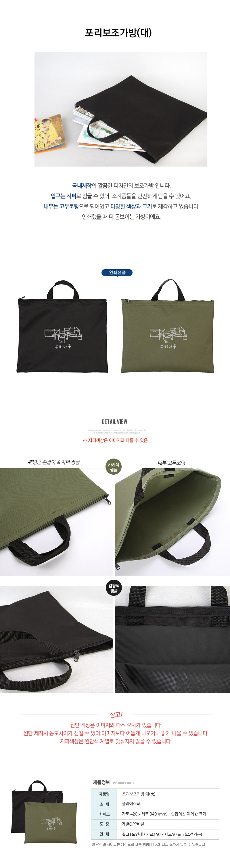 •420×340mm •검정, 카키 / 별색 문의 •입구 지퍼 있음 •1색 100개 이상 ※ 사이즈는 ±2cm정도 오차가 있을 수 있습니다.