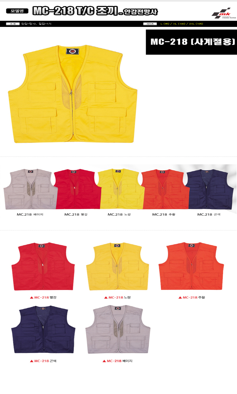 •Size : L, XL, 2XL •소재 : 안감-망사, 겉감-T/C(안감전망사) ※단가변동 있을 수 있습니다. 제품 색상은 인쇄된 것이므로 실제 제품과 다소 차이가 있을 수 있습니다. MC-218