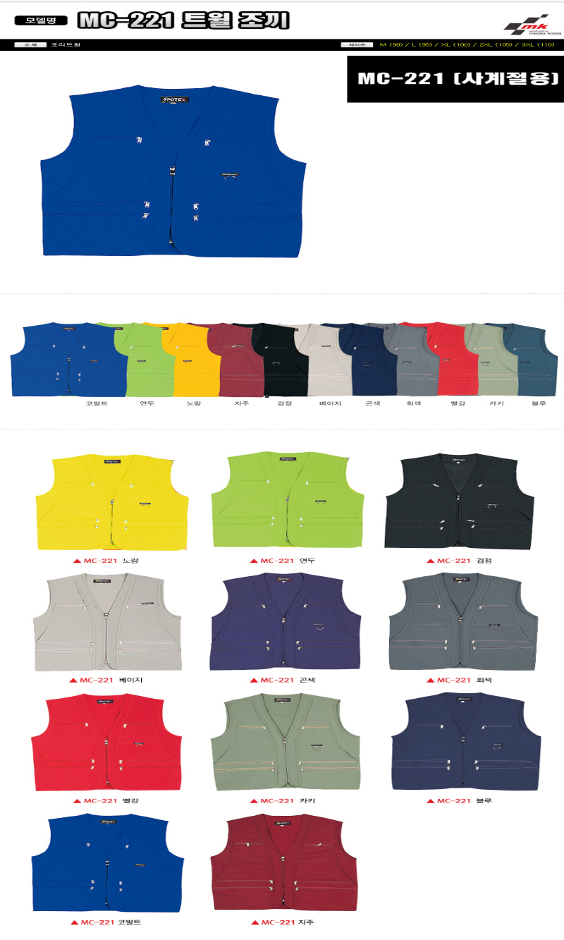•Size : M, L, XL, 2XL, 3XL •소재 : 포리트윌 ※단가변동 있을 수 있습니다. 제품 색상은 인쇄된 것이므로 실제 제품과 다소 차이가 있을 수 있습니다. MC-221