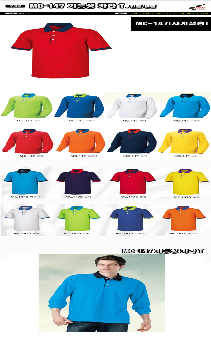 MC-147 •Size : S, M, L, XL, 2XL, 3XL,4XL •소재 : 쿨로P.K ※단가변동 있을 수 있습니다. 제품 색상은 인쇄된 것이므로 실제 제품과 다소 차이가 있을 수 있습니다.