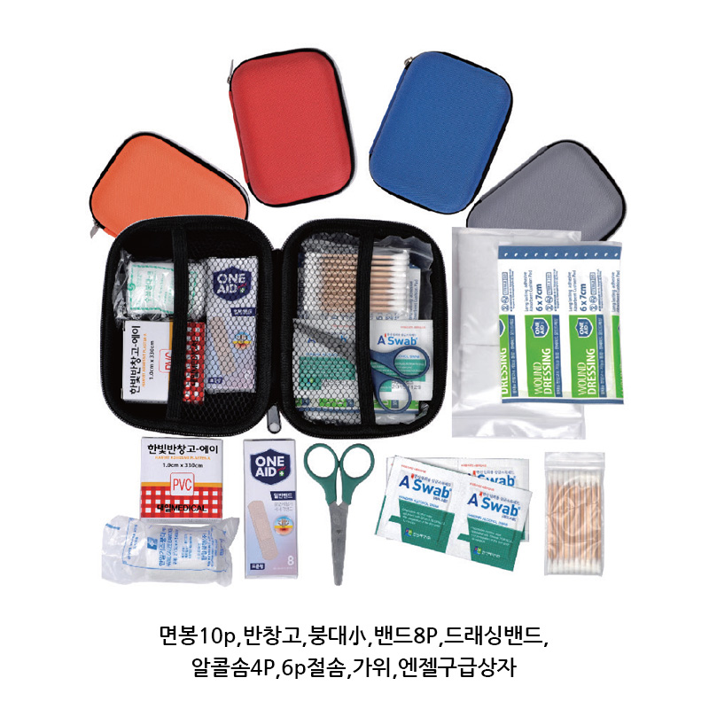 면봉10p,반창고,붕대小,밴드8P,드래싱밴드, 알콜솜4P,6p절솜,가위,엔젤구급상자