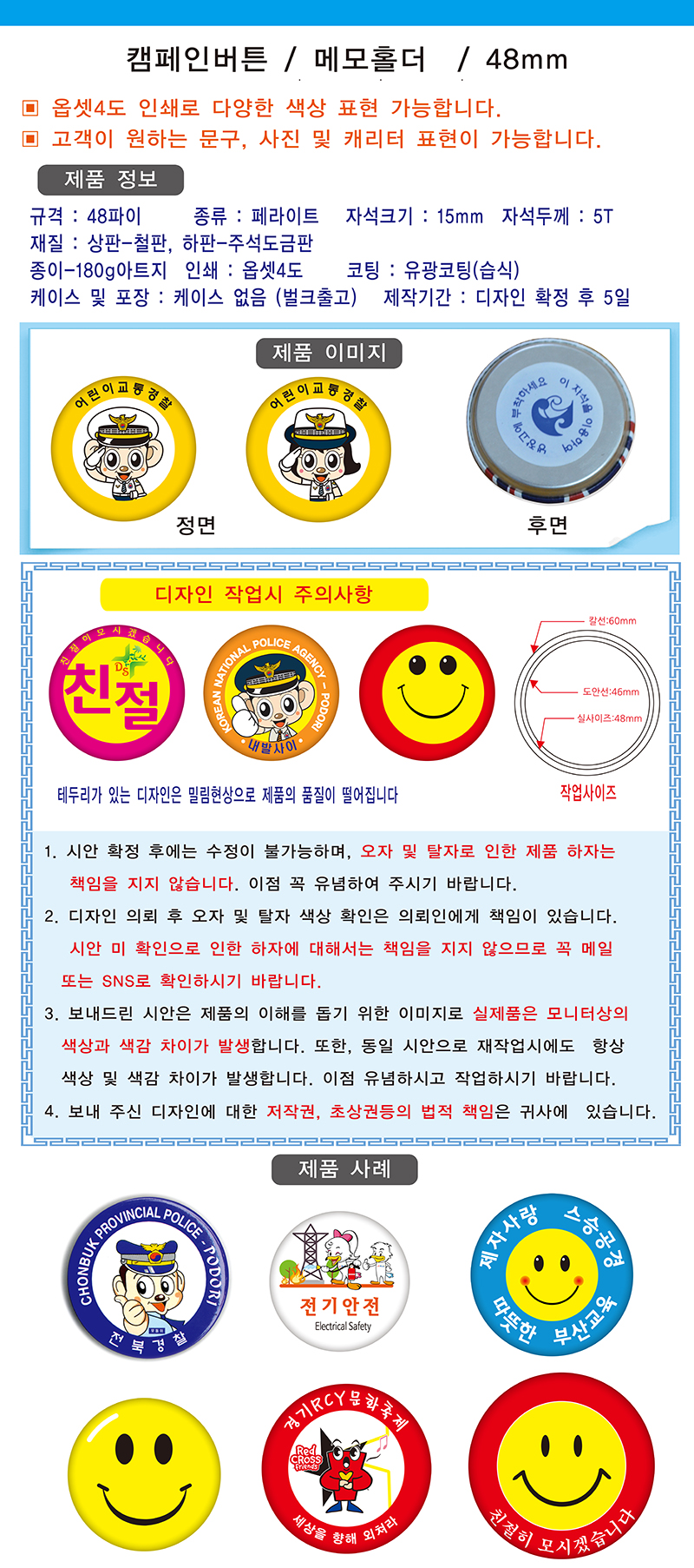 •1,000EA •기본수량 : 100EA •1,000개 이하 가격 별도 문의 •도안선:46mm / 칼선:60mm 제품 상세 설명 / - 재질 : 철판 / 옵셋인쇄 (유광코팅) - 케이스 및 포장 : 케이스 없음 (벌크출고) - 제작기간 : 디자인 확정 후 5일
