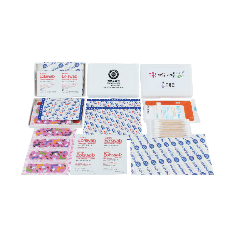 •SIZE : 115X75X22(mm) •수량 : 400EA / 1박스 : 250개 •스티커 비용 별도 • 표준밴드 8매, 방수밴드 4매, 면봉세트, 캐릭터밴드 5매, 알콜스왑 4매, 멸균거즈 ※모든 내용물들은 수급상황에 따라 예고없이 변경될 수 있습니다.