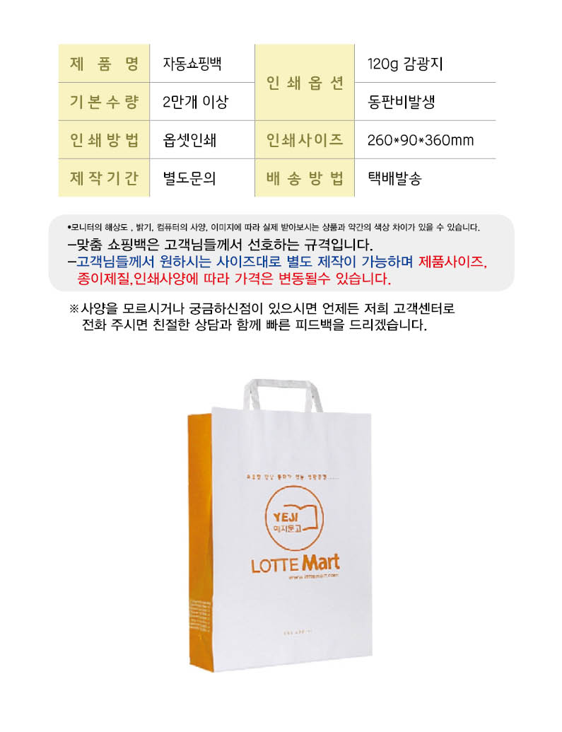 별도문의 •감광지 120g •기본수량 20,000개 이상 •Size : 260x90x360 mm •동판비 별도