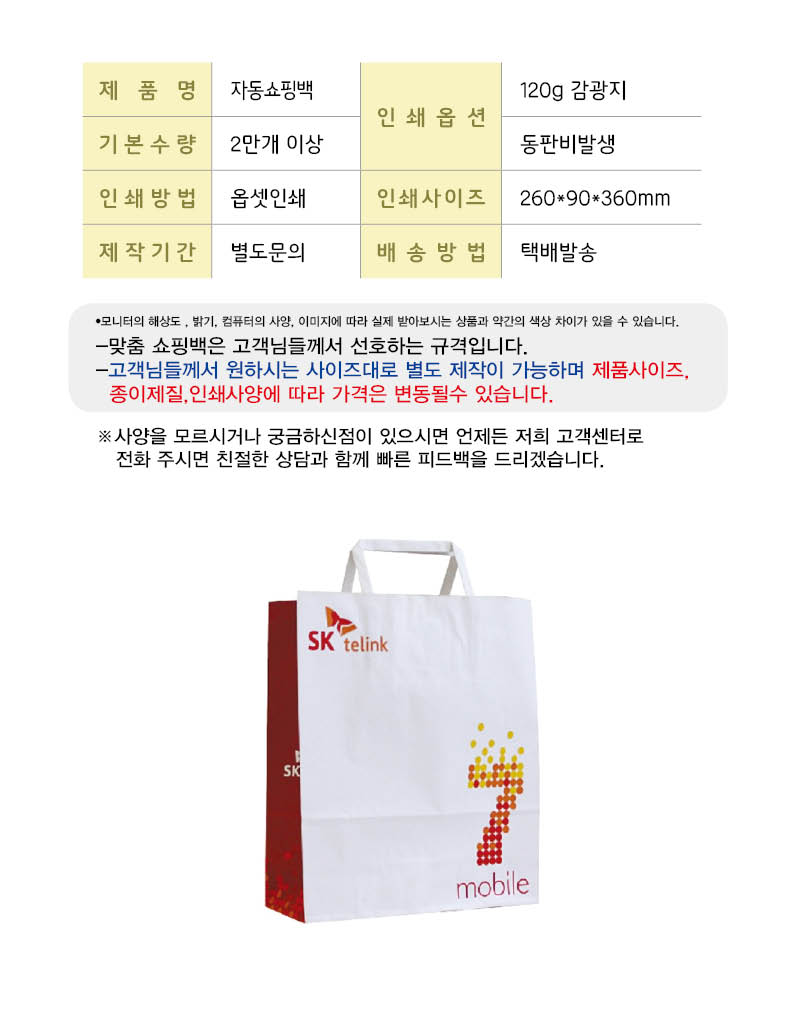 별도문의 •감광지 120g •기본수량 12,000개 이상 •Size : 260x90x360 mm •동판비 별도