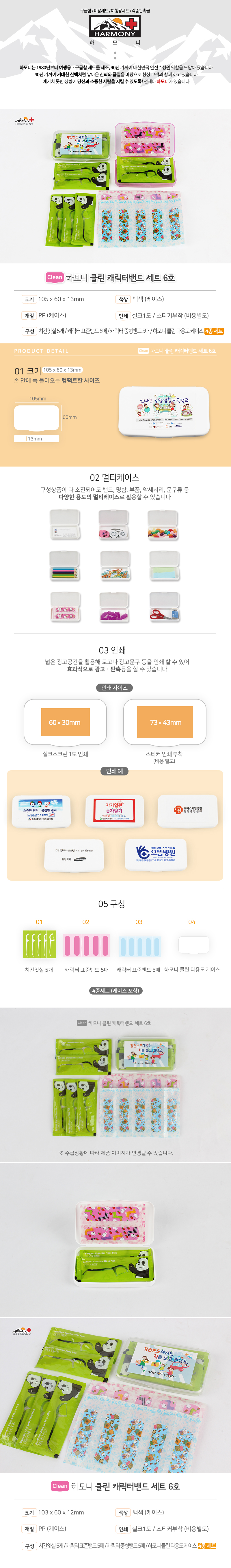 •캐릭터밴드 10매, 치간잇실 5개 •수량 : 1000EA •SIZE:105×60×13 (mm) •1BOX:500EA •스티커비 별도, 캐릭터밴드 1P추가 30원, 알콜스왑 1P 추가 30원 •종이케이스 200원 추가 ※상품 내 모든 구성상품들은 수급상황에 따라 예고없이 변동 될 수 있습니다.
